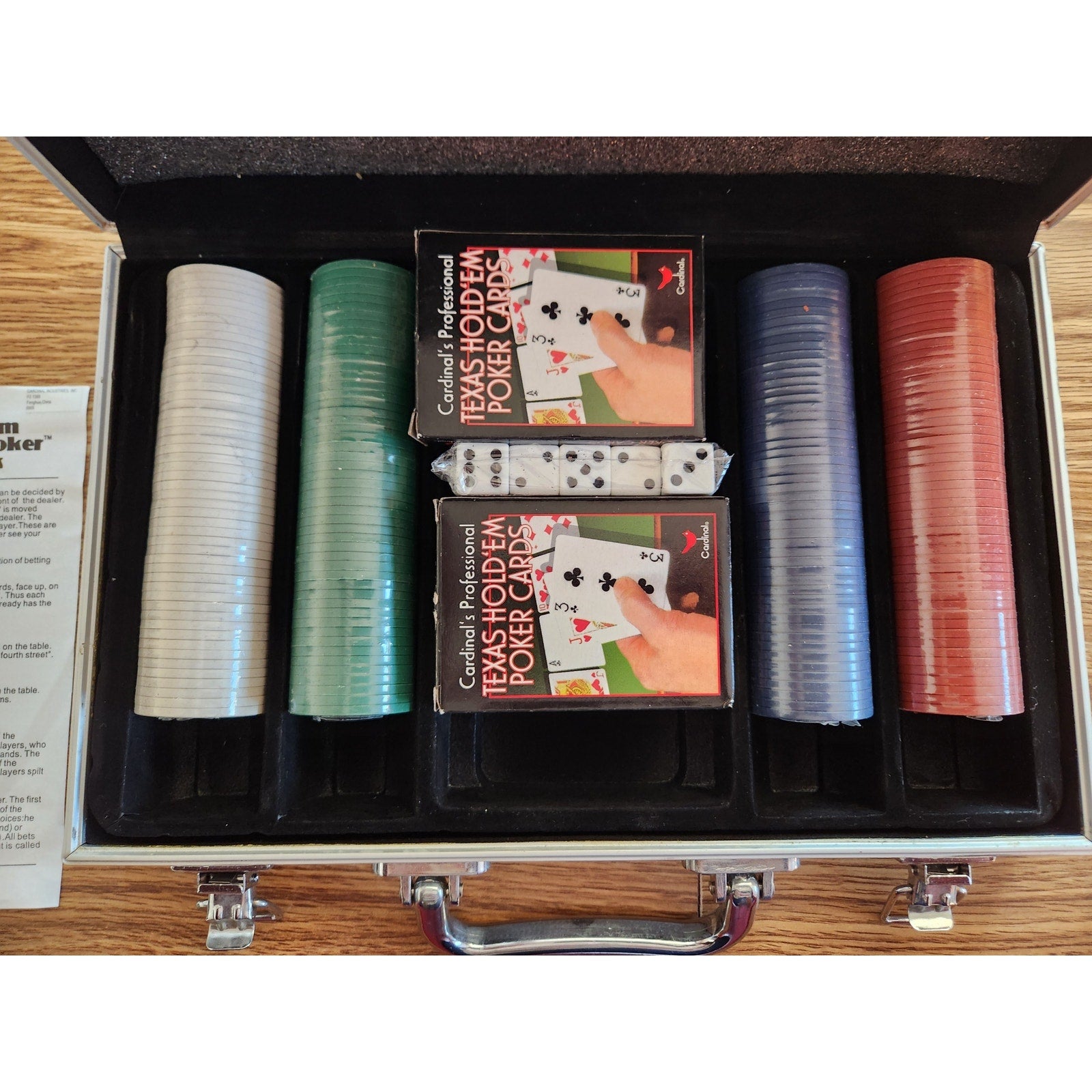 Condition: The metal case shows wear from use, but the poker chips and dice are still sealed in their original plastic. The playing cards are included and in good condition.