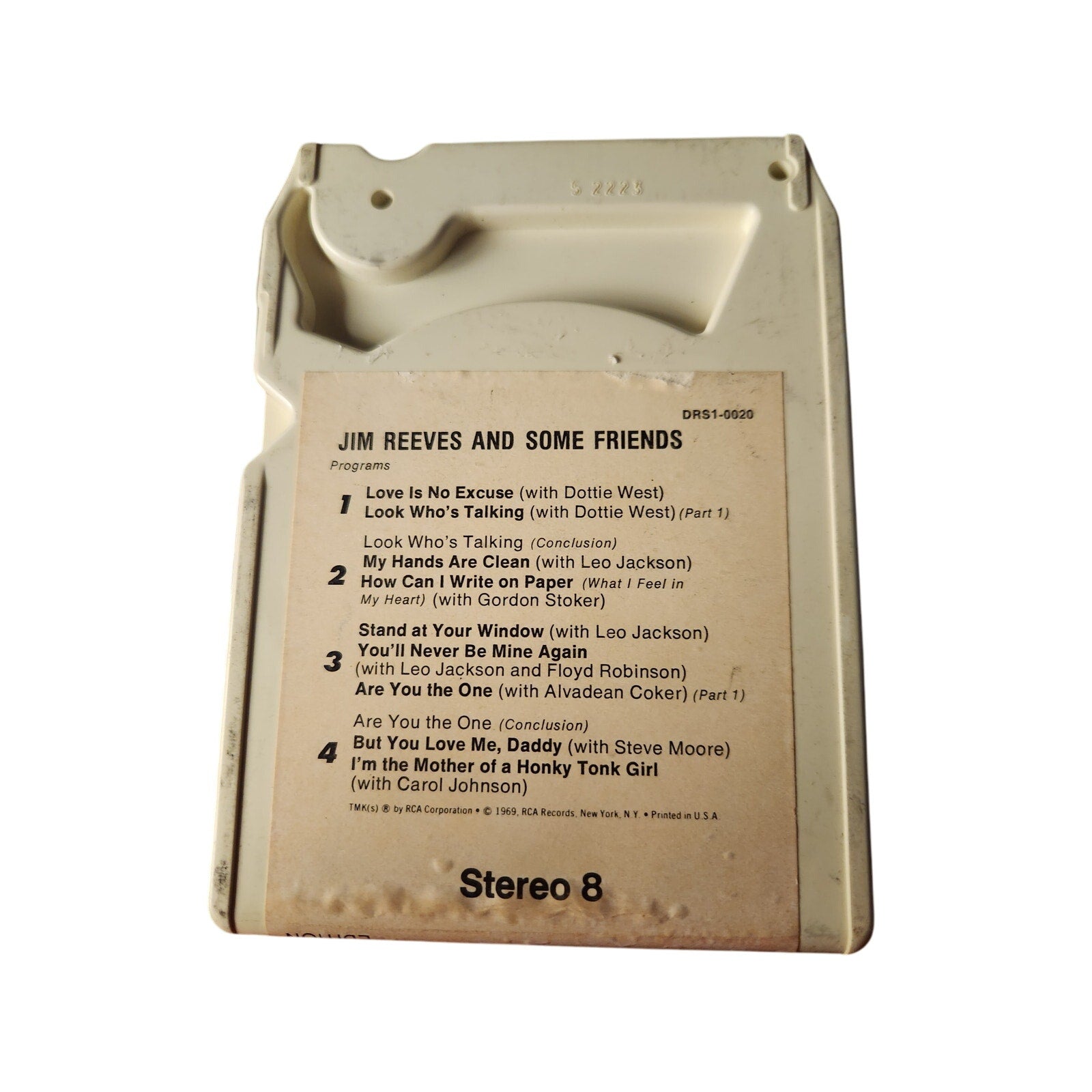 This rare collectible features the catalog number DRS1-0020 and is a Stereo 8 format. The cartridge includes a tracklist of classic songs performed by Jim Reeves and other artists, such as Dottie West, Leo Jackson, and more.